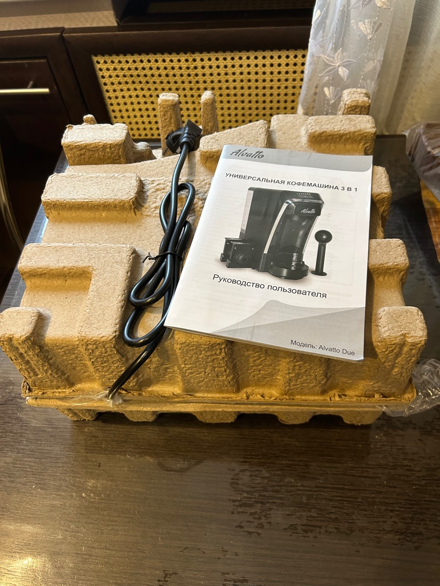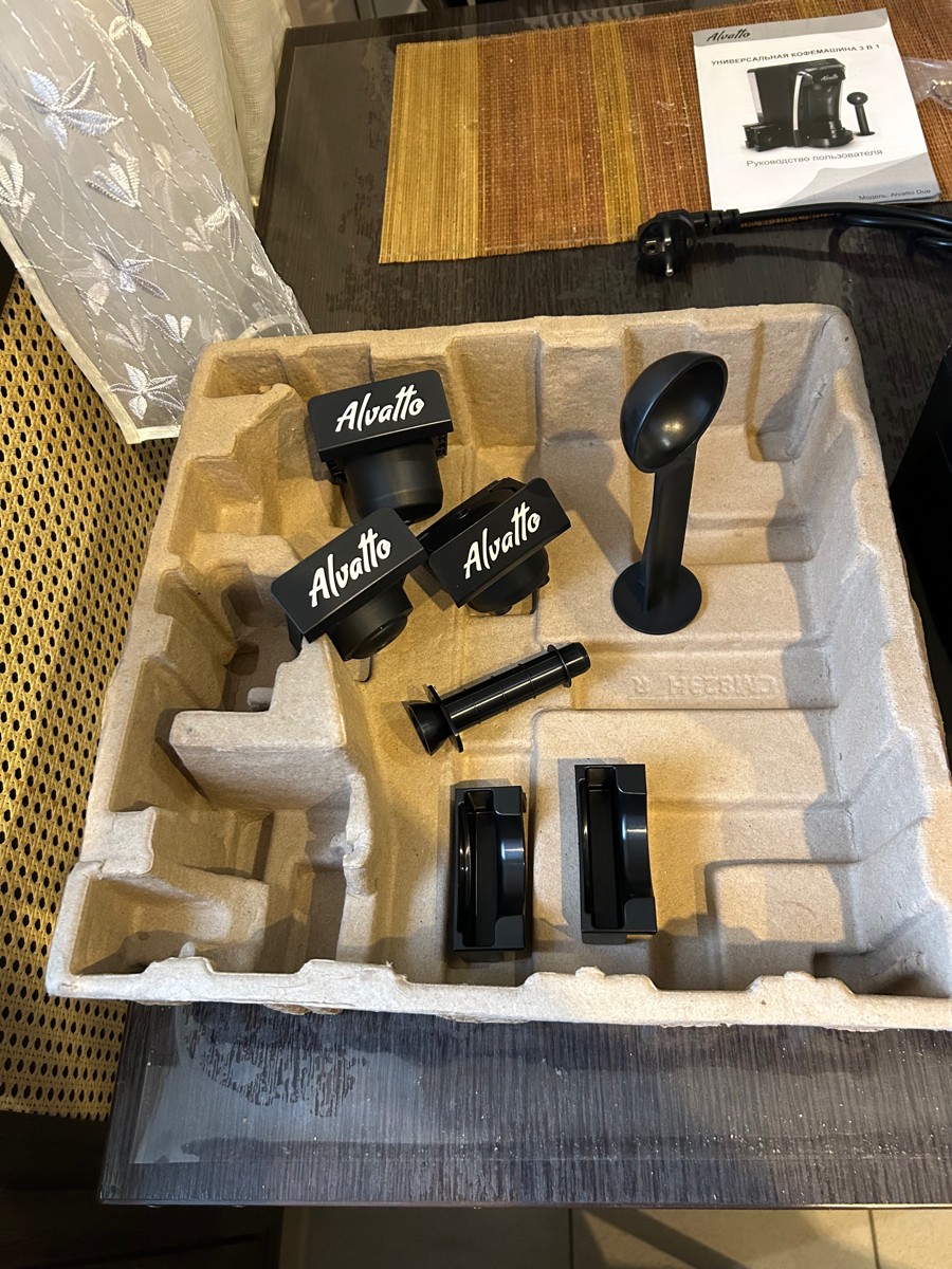 | Комплектация | Кофемашина - 1шт., Резервуар для воды с крышкой, 1л. - 1 шт., Адаптер для молотого кофе - 1 шт., Адаптер для капсул Nespresso - 1 шт., Адаптер для капсул Dolce Gusto - 1 шт., Мерная ложка-пресс - 1 шт., Инструкция на русском языке - 1 шт., Держатели для хранения адаптеров - 2шт. |